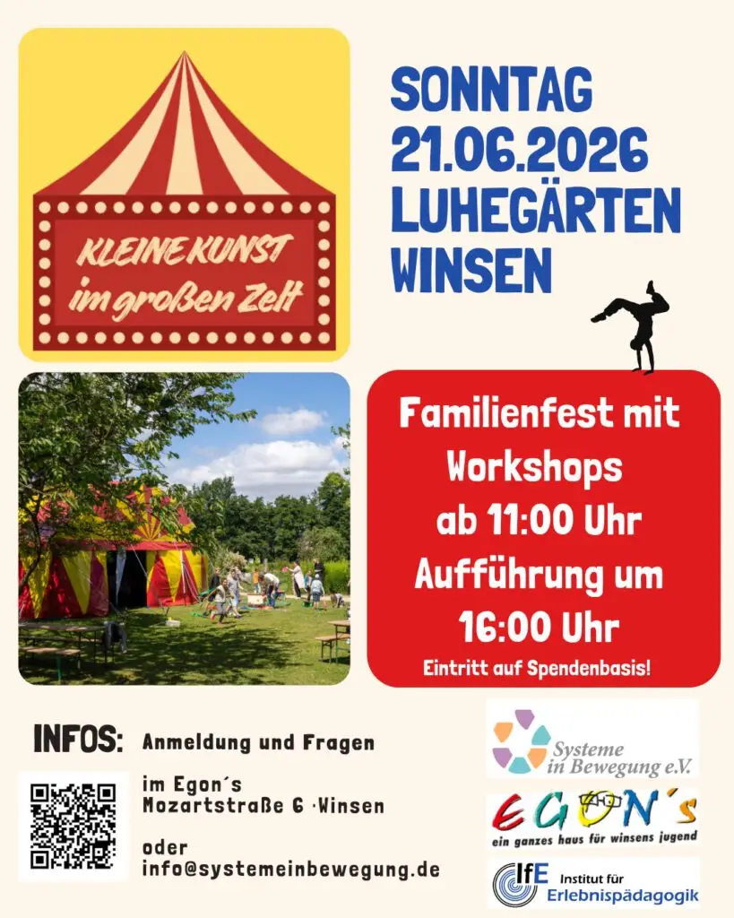 Auch in diesem Jahr veranstalten wir wieder gemeinsam mit der Stadtjugendpflege Winsen und dem Verein Systeme in Bewegung e.V. das Jugendkulturfestival „Kleine Kunst im großen Zelt“ in den Luhegärten. Das große Familienfest findet am 21.6. statt, ab 11:00 gibt es Spiel und Spaß, Essen und Trinken und stündlich wechselnde Workshops: